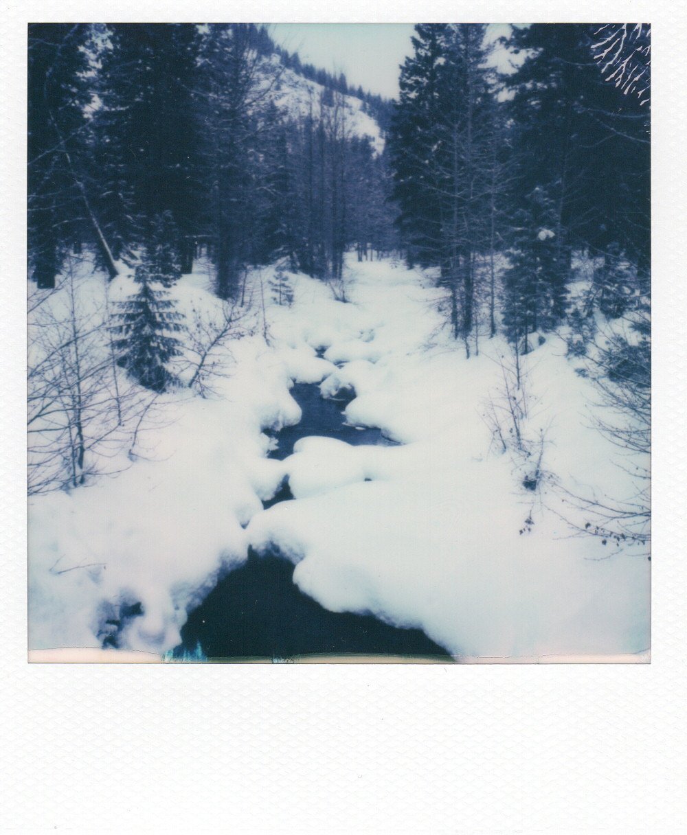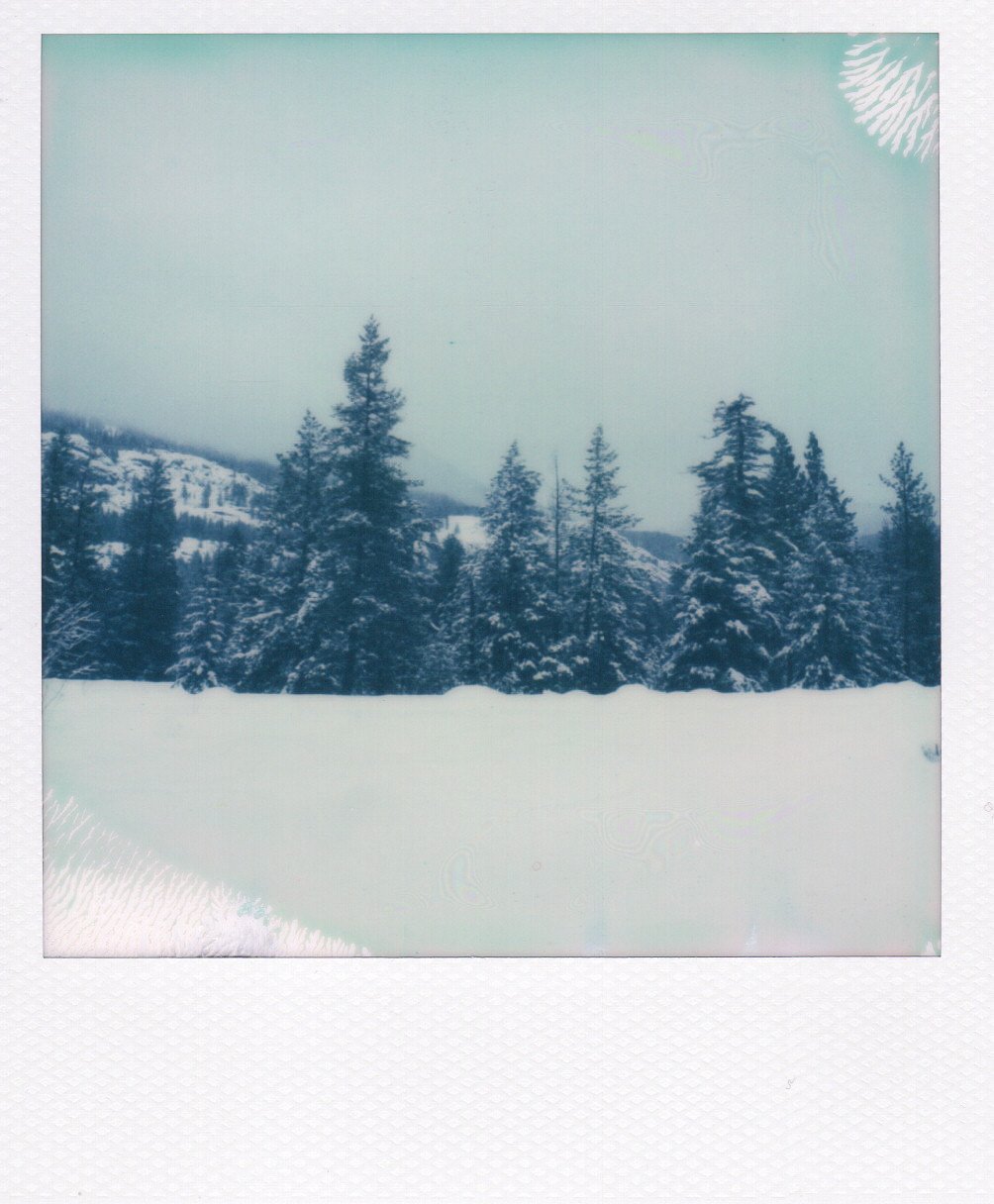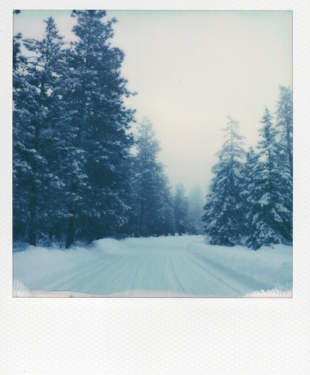 I selected a pack of i-Type film to shoot while on our New Year’s ski trip to the Methow Valley. Snow was abundant this year and there were plenty of scenes to turn my camera to. Polaroid says that film performs best between the temperatures of 55 – 82°F and this winter was maxing out somewhere near freezing, if we were lucky. Polaroid also says photographs taken below 55°F will often turn out over-exposed, lacking color contrast and with a green tint. They recommend doing all you can to keep the film and the camera warm before, during, and after shooting to ensure proper developing. I learned that it’s difficult to quickly pull out the film and tuck it into the warmth of a pocket while wearing thick gloves, so you’ll see my fingerprint on the edge of many of the images.